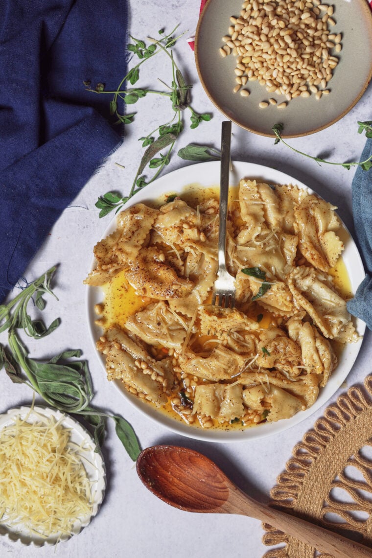- Add the .25 oz of chopped sage and stir until combined. Top each serving of ravioli with a few spoonfuls of sauce. Top each plate with a sprinkle of pine nuts. Enjoy!