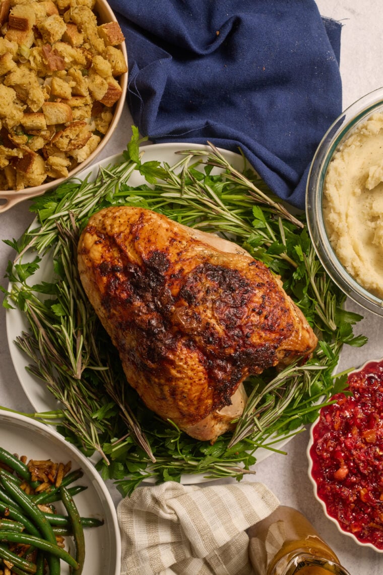 If you pull your bird from the oven and the skin is still pale, don’t worry. Move it to a higher rack or turn on convection for the remainder of the cooking time. You can even brush on a bit of melted butter or olive oil and return it to high heat to finish crisping.