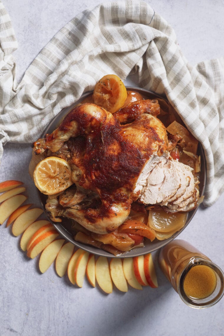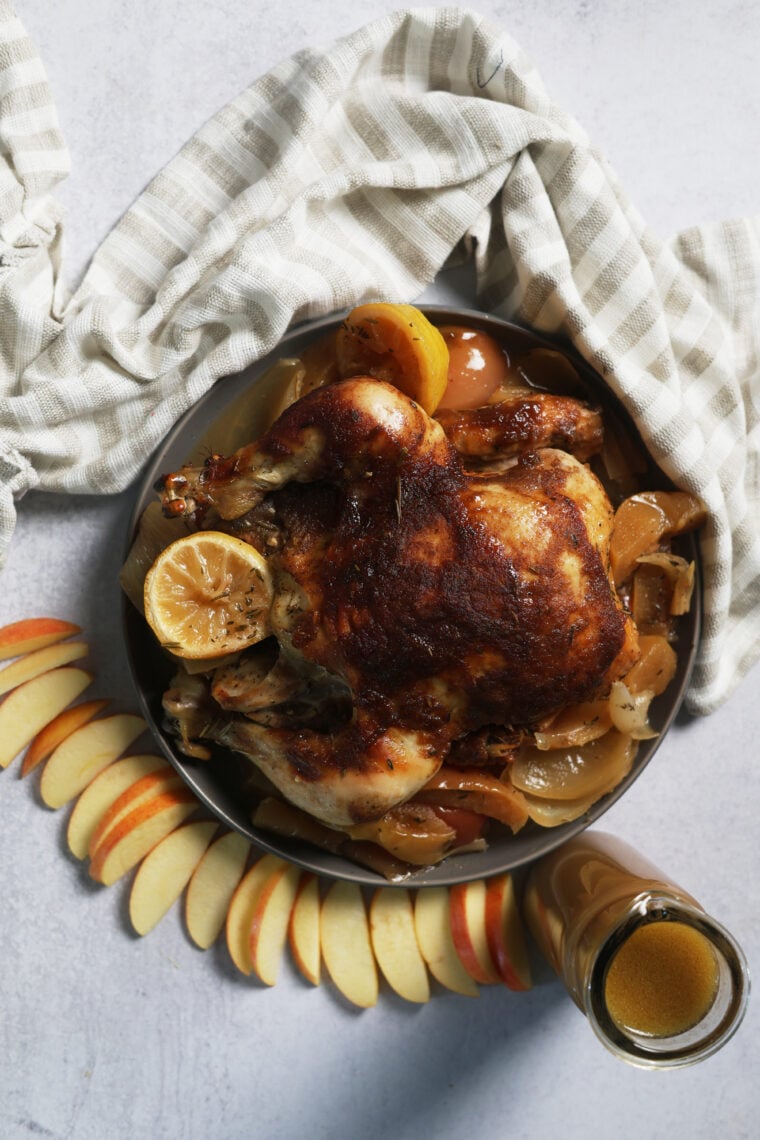 The beauty of this recipe lies in layering flavors and moisture. Roasting the whole chicken with apple cider and apple slices in a covered Dutch oven locks in steam, keeping the dark meat tender and the chicken breast juicy. When the apple butter and brown sugar melt together, they create a natural caramelization that helps the skin turn golden brown. Letting the chicken rest for at least 15 minutes afterward allows the juices to redistribute (so they don’t run out when you carve it). The fresh herbs- thyme and rosemary- infuse the savory sauce with aroma, while a splash of lemon brightens everything. It’s the perfect marriage of chemistry and comfort food.