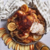 This apple cider roasted chicken is the ultimate cozy meal for chilly nights. The apple butter chicken glaze gives the bird a glossy finish and adds a sweet contrast to the garlic and herb roasted chicken flavor. It’s the perfect example of sweet and savory chicken roast done right- comforting, flavorful, and beautifully balanced with fresh herbs and apple slices.