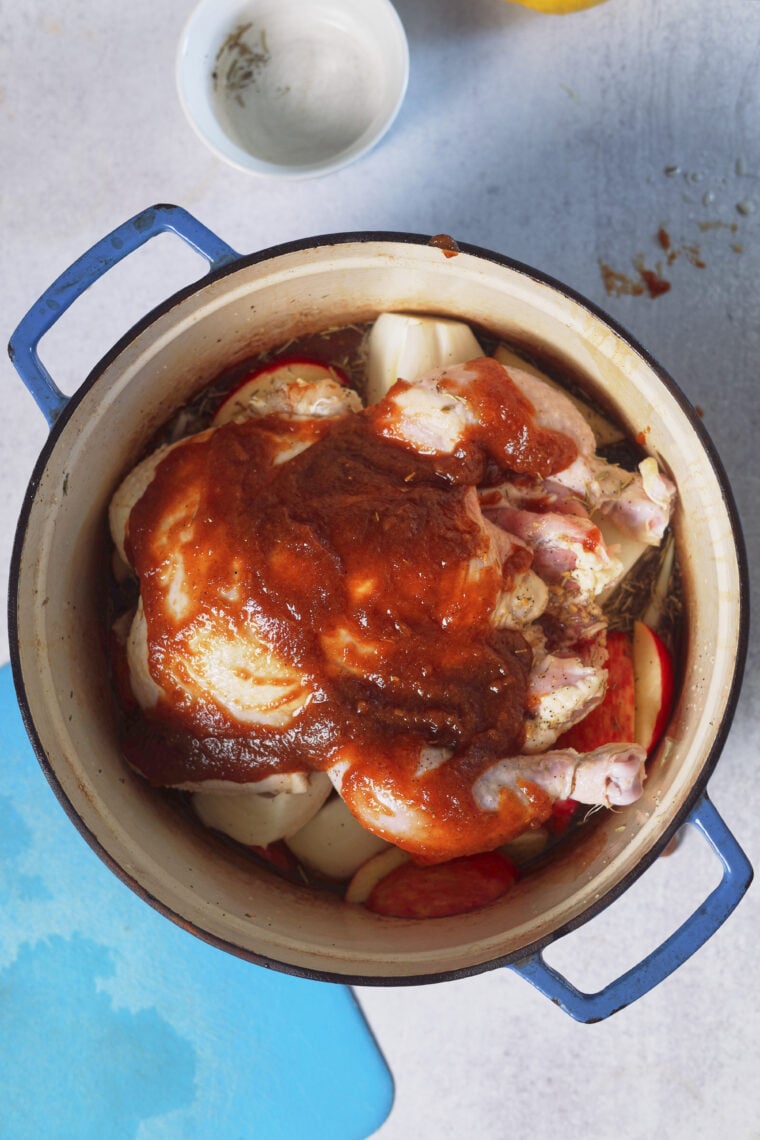 - Drizzle the apple butter mixture all over the chicken. Place the lid on and place it in the oven.
